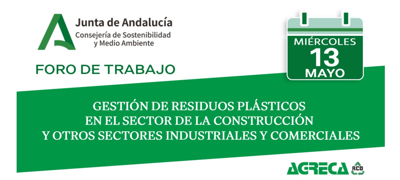 Foro de trabajo. *Gestión de Residuos Plásticos en el Sector de la Construcción y otros Sectores Industriales y Comerciales.* Miércoles 13 de mayo en Salón de Actos de Edificios Múltiples de 9.00 a 14.30h. Para más información, pincha aquí: https://agreca.es/inscripcion-foro-de-trabajo/